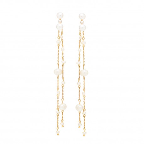 Te kolczyki ślubne to kwintesencja delikatności. Misternie ułożone perły na delikatnych łańcuszkach tworzą wyjątkowy wzór, który doskonale komponuje się z eleganckimi stylizacjami ślubnymi, dodając im wyjątkowego wdzięku i naturalnego piękna.