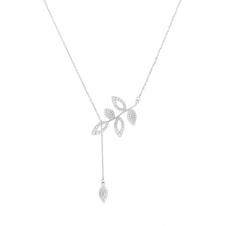 Back to siteNaszyjnik wykonany ze srebra próby 925 to nasza propozycja dla pań lubiących delikatne dodatki. Srebrny łańcuszek ozdobiony subtelnymi listkami wysadzanymi cyrkoniami sprawdzi się zarówno w ślubnej stylizacji jak i codziennym look'u.